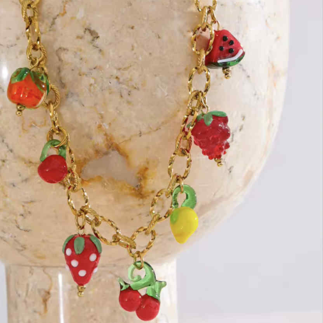O colar Frutas Coloridas é o acessório perfeito para celebrar a estação ensolarada. Com suas cores brilhantes e cobertura frutada, ele evoca o frescor e a doçura da primavera e do verão. Seja para um dia ensolarado ou uma noite de verão, esta joia dará um toque de alegria a todos os seus looks.