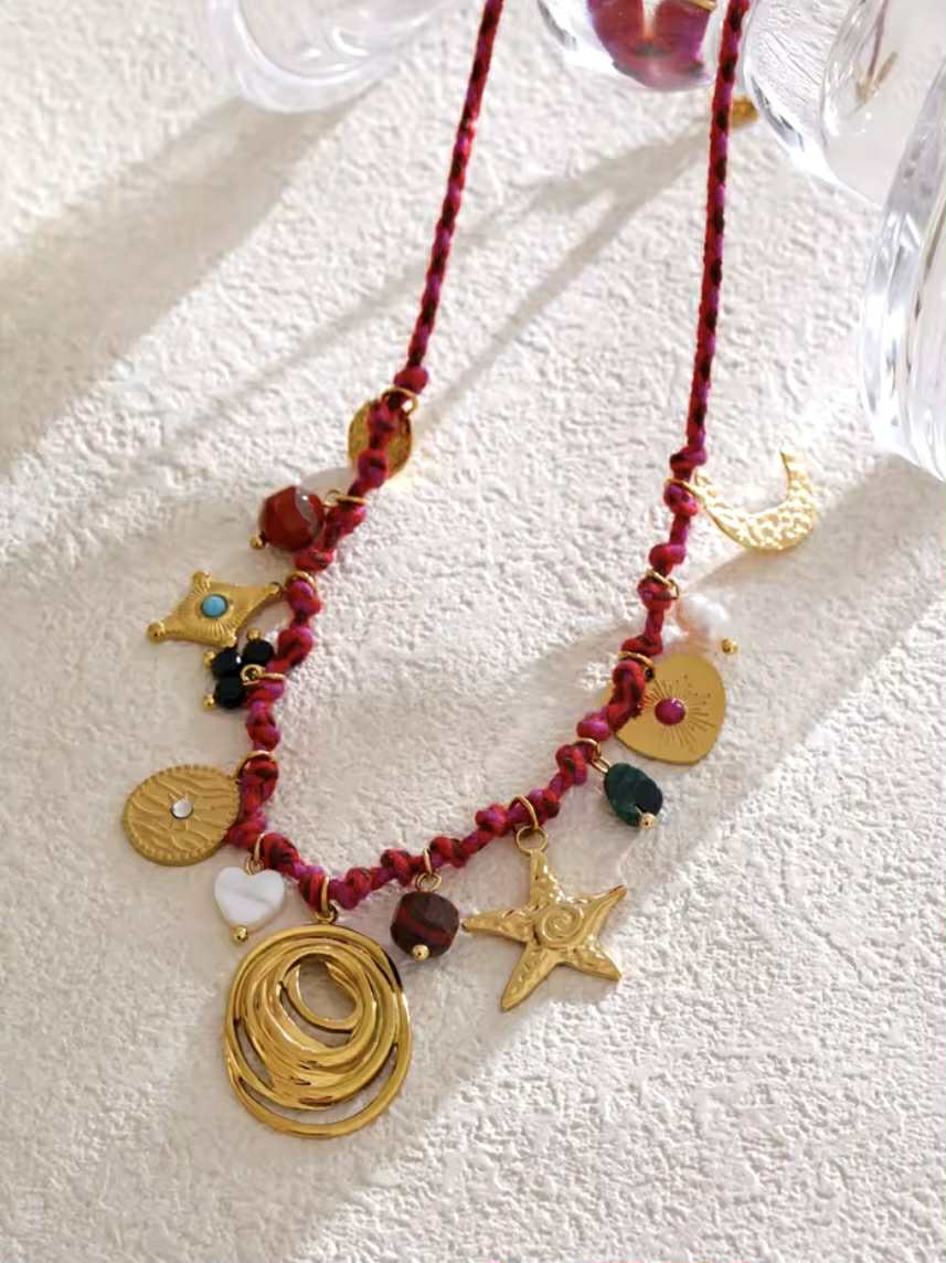 Deixe-se encantar por este colar tecido à mão, inspirado no universo cósmico. Desde a gota de água, símbolo de pureza, às pedras naturais e aos motivos lunares e estelares, cada pormenor conta uma história. Uma peça de joalharia poderosa e calmante, concebida para quem gosta de usar um pouco do céu ao pescoço.