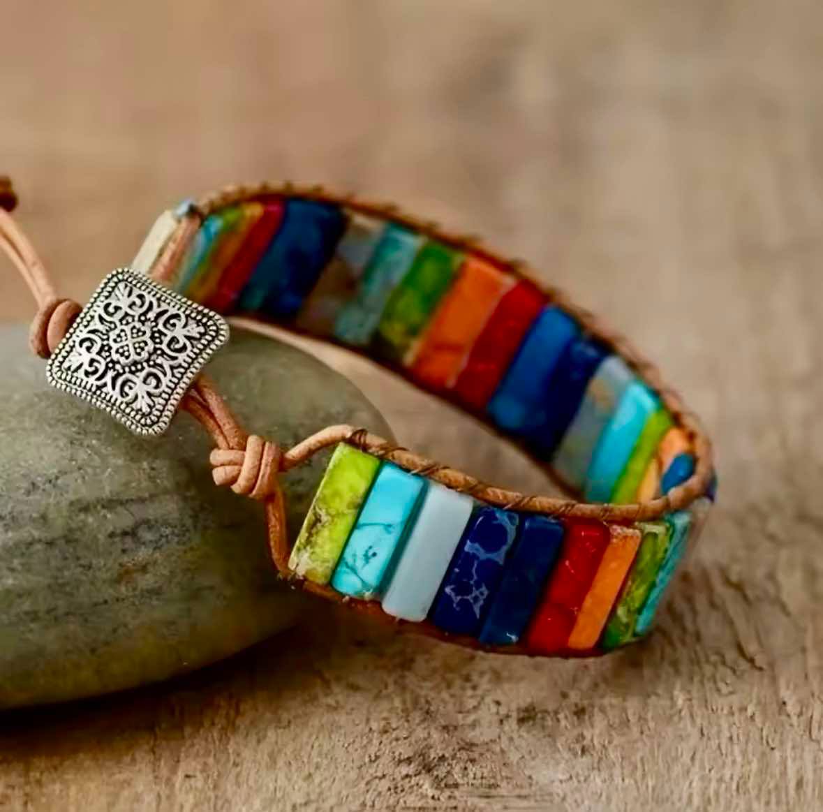 Descubra o equilíbrio interior com esta pulseira única, concebida para estimular e alinhar os seus chakras. Fabricada com pedras de jaspe de cores vibrantes, favorece a concentração, a meditação profunda e o sucesso. O seu design elegante e ajustável em pele faz dela um acessório prático e estético, perfeito para o seu dia a dia.