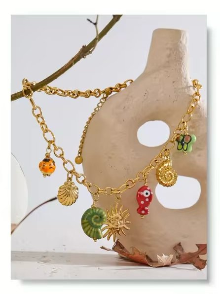 Deixe-se seduzir pelo estilo único do oceano deste colar. Adornado com motivos como a concha, o peixe, a borboleta e a gota de sol, esta peça de joalharia evoca a beleza e a serenidade do mar. Cada detalhe foi cuidadosamente concebido para captar a essência da natureza, dando um toque de evasão ao seu visual quotidiano.