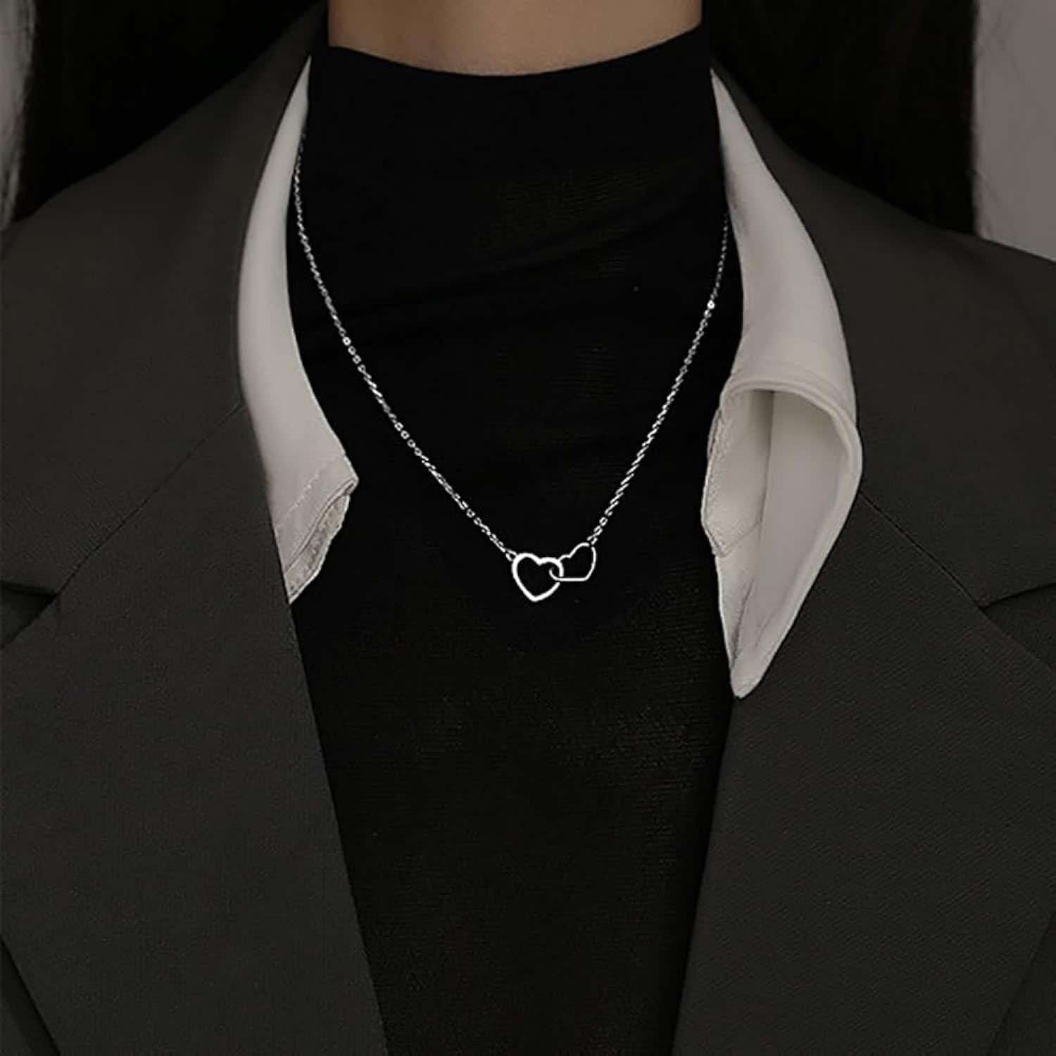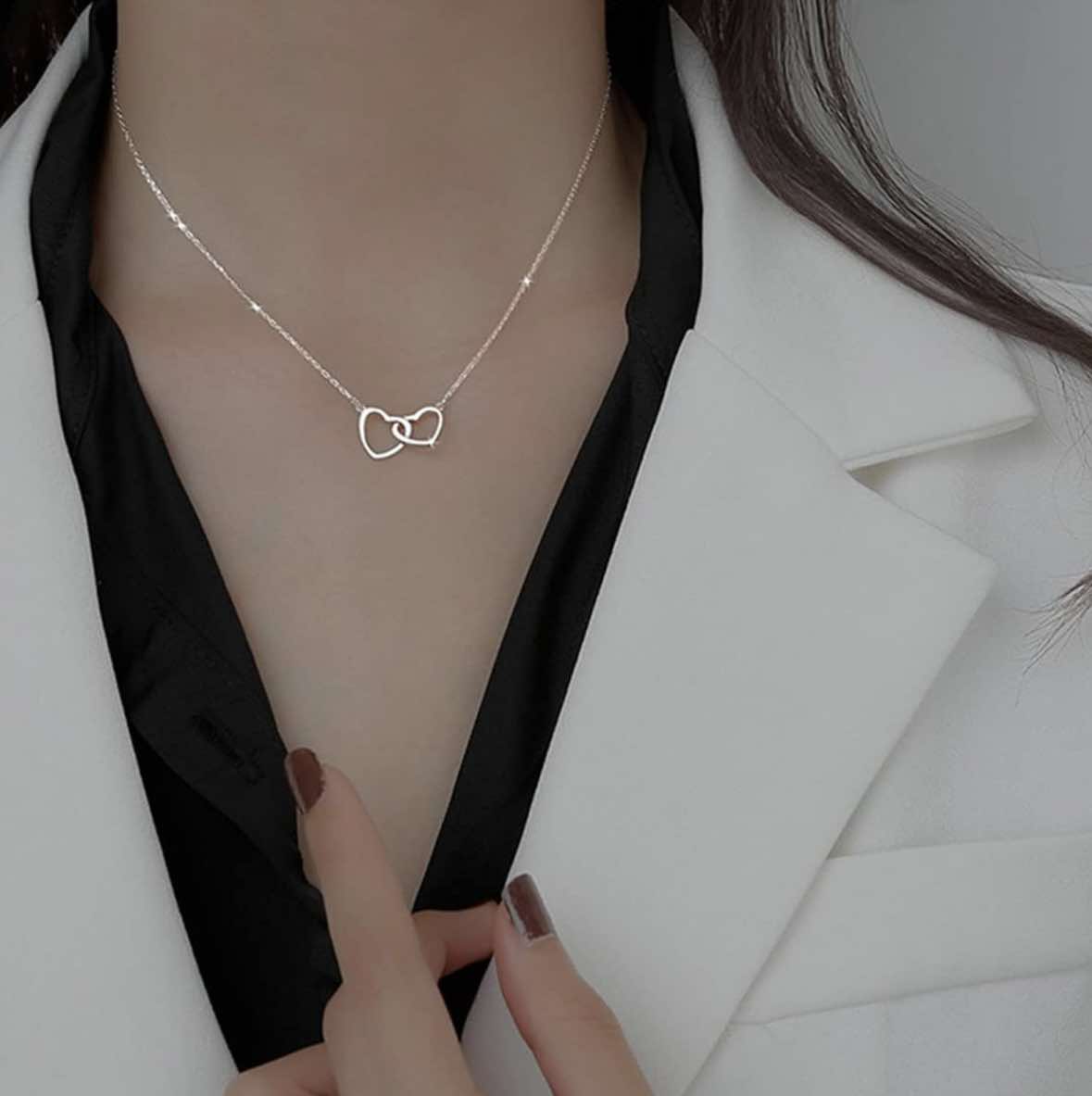 O colar apresenta um coração duplo oco entrelaçado, que simboliza a união e o amor eterno. O seu estilo minimalista e atual torna-o um acessório versátil que combina na perfeição com roupas chiques ou casuais. Todos os pormenores foram cuidadosamente pensados para criar um look suave e feminino.