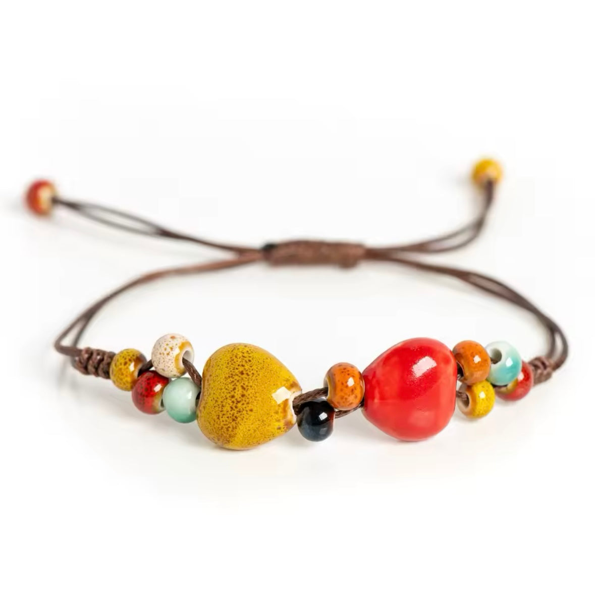 As contas de cerâmica, com 16x15x10mm, são cuidadosamente selecionadas para dar um toque de brilho e carácter a esta peça de joalharia. A mistura de cores vibrantes e texturas requintadas confere à pulseira Heart to Heart uma identidade forte, perfeita para quem gosta de acessórios distintos e de estilo boémio.