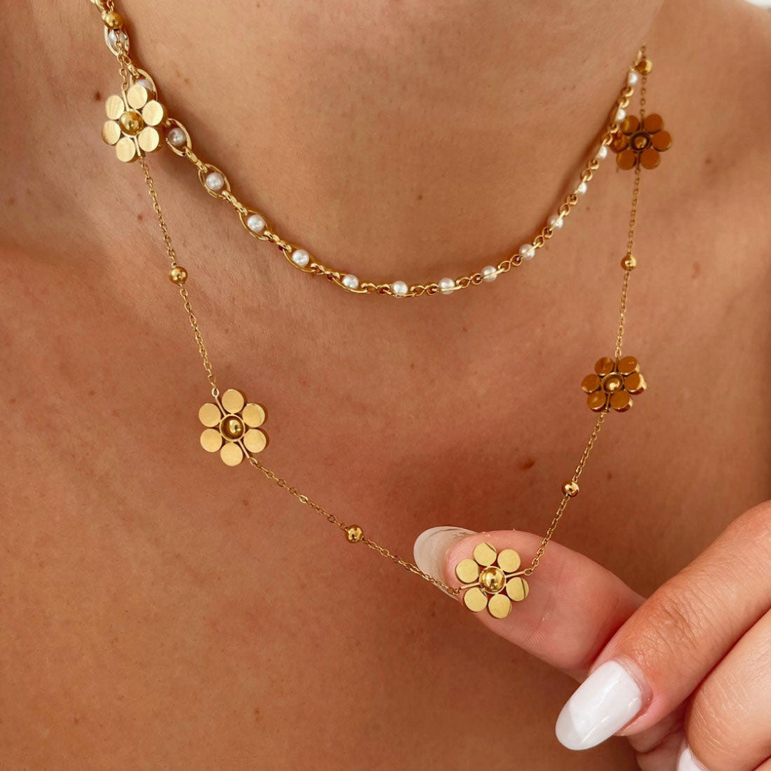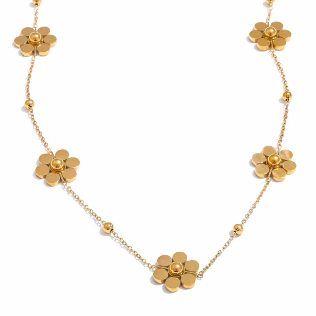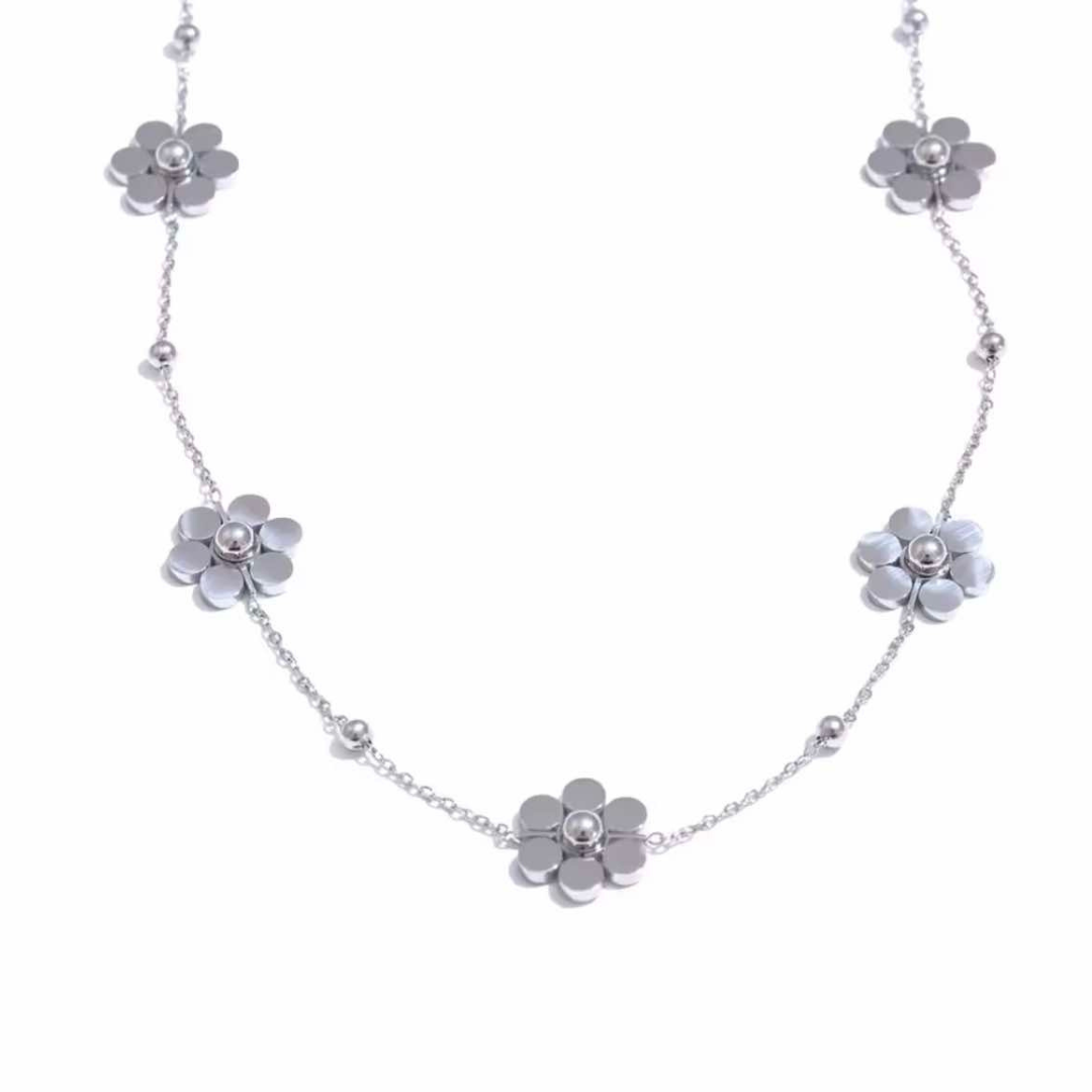 Descubra a nossa corrente de flores em aço inoxidável, uma peça de joalharia que combina sofisticação e modernidade. Concebido para as mulheres que apreciam o estilo e a qualidade, este colar de moda é um verdadeiro trunfo para qualquer guarda-roupa. O seu delicado design floral confere um toque de elegância, perfeito para realçar qualquer conjunto, quer seja para uma ocasião especial ou para o dia a dia.