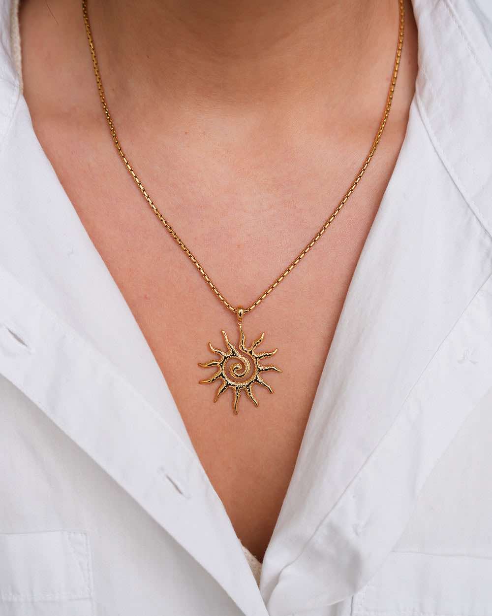O colar “Luz do Sol” combina com todos os estilos e todos os conjuntos. Quer o use com um vestido leve de verão ou com um conjunto mais elegante, completará o seu look com elegância. A sua versatilidade faz dele um must-have na sua coleção de jóias, para o dia a dia ou para ocasiões especiais. Deixe a sua personalidade transparecer com esta joia que exala alegria e luz!