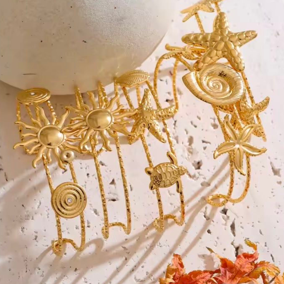 Adornada com estrelas-do-mar, conchas e sóis, esta pulseira capta o espírito das férias de verão. Estes motivos evocam o mar, a areia quente e as paisagens ensolaradas, fazendo desta peça uma memória preciosa para usar nas suas escapadelas ou simplesmente para manter o espírito das férias vivo durante todo o ano.
