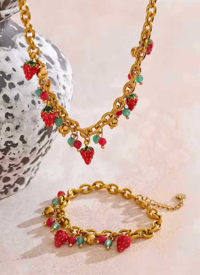 Quer se trate de uma saída com os amigos, de uma saída à noite ou simplesmente para realçar o seu estilo quotidiano, este conjunto de jóias em esmalte vermelho e pedra morango é ideal. O seu design moderno e colorido confere um toque fresco e feminino ao seu look, permitindo-lhe afirmar a sua personalidade com elegância.